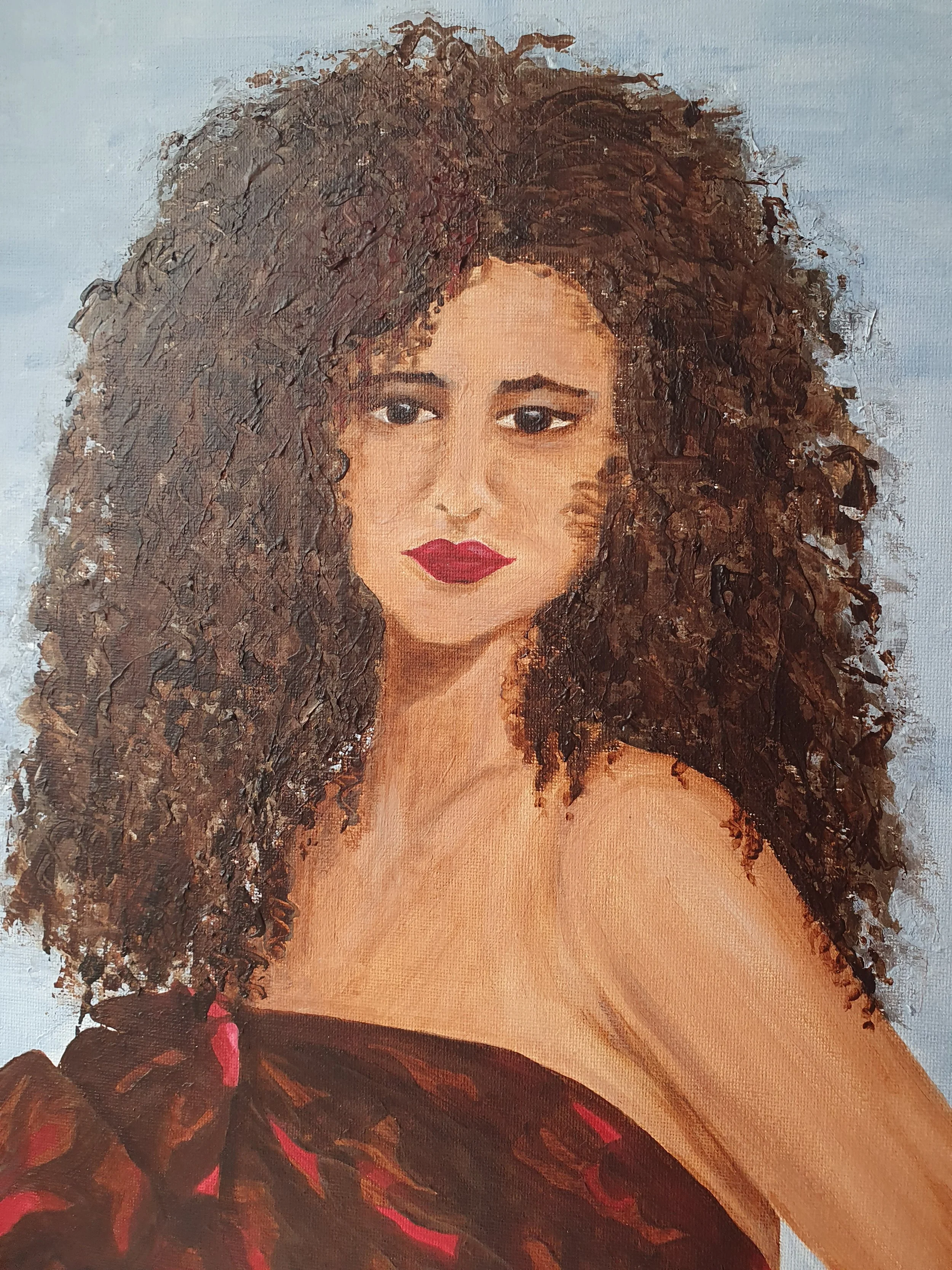 Red came from a new look at a very old pencil drawing I made in the early 1990’s. I loved the direct gaze and strong features of the model. The painting is my imagined colour scheme and reds just found their way in. Red is for sale in my online shop.